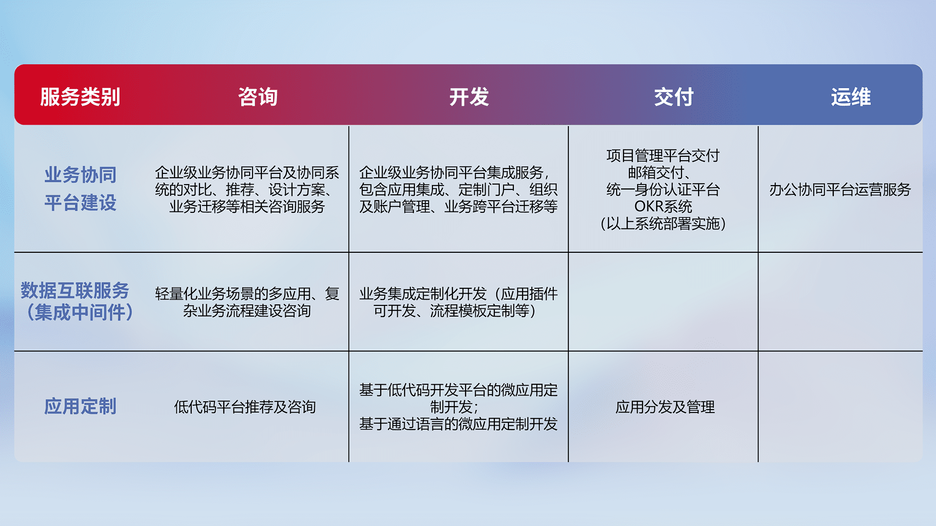 针对钉钉、、、企微、、、、IDaas等平台级产品提供产品的规划、、方案、、、、交付、、、定制化开发等服务,,,实现如统一协同办公、、智能客户服务、、混合会议管理、、、、智能数据查询、、等业务场景,,实现数字化转型。。