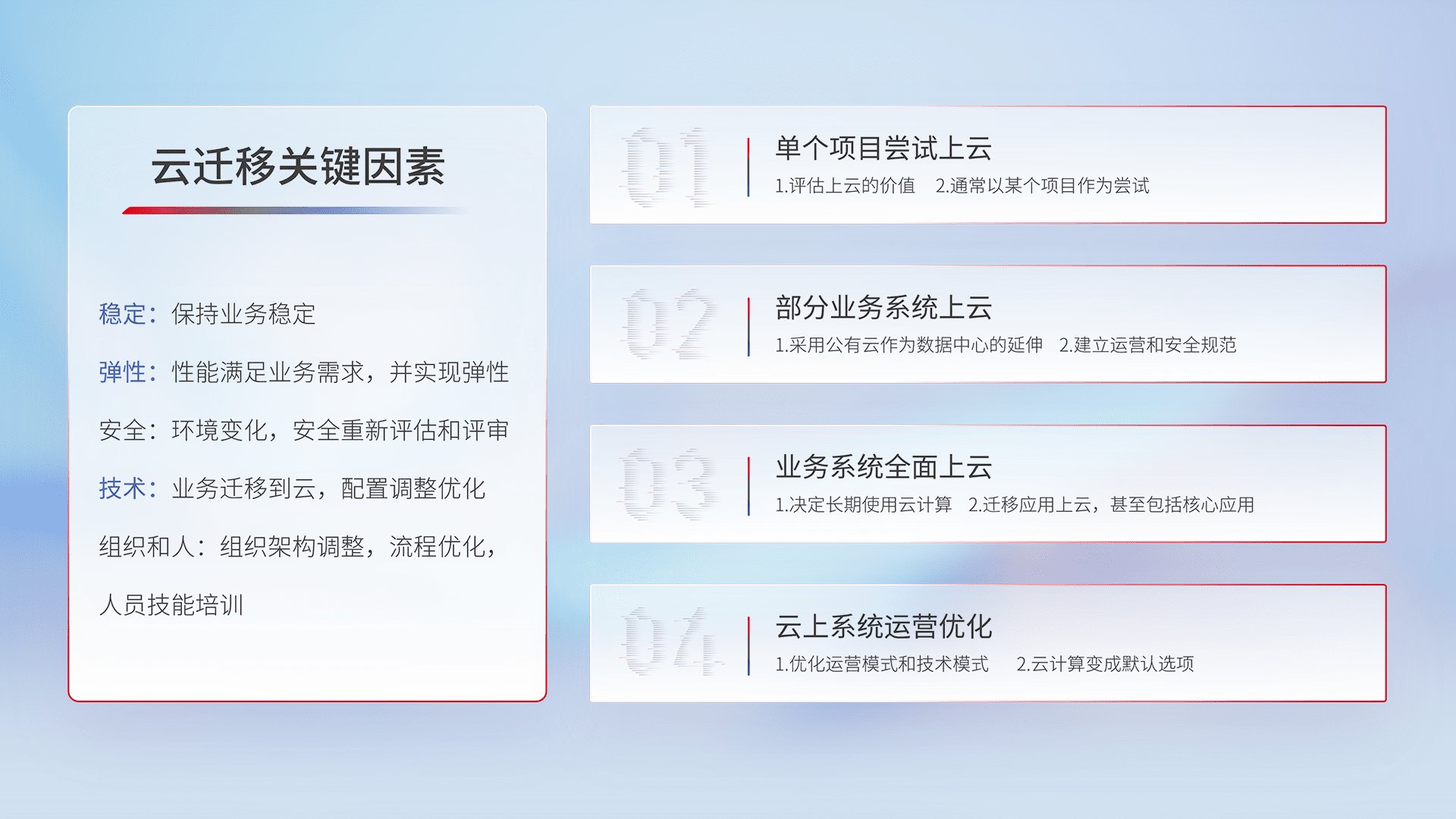 结合实际业务,,从规划设计、、云平台选型、、、、云原生改造、、、、数据迁移、、、集成交付,,迁移全过程为客户识别最佳上云路径,,做好风险识别管理,,设计网络架构、、、身份权限、、安全审计合规、、、操作审计、、、、日志审计、、、监控告警策略、、多站点容灾设计等,,对云上基础设施进行整体规划,,,,提升IT治理水平,,以满足弹性、、、高可用、、高性能的需求。。