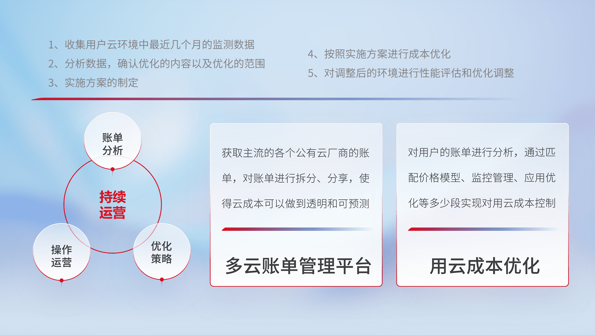 通过多云纳管,,以统一的资源数据模型把客户的云资源进行抽象和封装,,,,进而实现对多云资源的统一操作,,,保障云资源管理的可靠性、、、稳定性与可用性。。。量身定制化运维内容,,,配置、、、、开发运维、、补丁管理、、、备份、、、监控、、、认证和访问管理、、、、审计和日常巡检等,,保障在用云过程中的可靠度,,,,稳定度以及高可用率。。